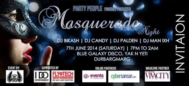 Party People Proudly Presents "Masquerade Night" Dj Candy Dj Man Ixh Dj bikash Dj Palden Venue - Blue Galaxy Disco , Yak & Yeti ,Durbarmarg ( old Club Platinum ) Time - 7pm to 2am Date - 7june More info uploading soon........................ contact Sapan Magar 9808263228,9843402821 for more ..