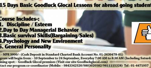 Fee: - NPR 5000/- (Cash Deposit in Standard Charted Bank Account No. 01-2630478-01) Program will begin from: - 10 September to 24 September, Everyday 7:00 AM to 8:30 AM (Including Saturday) Training spot: - Goodluck Glocal premises (Visit our site Goodluckglocal.com) Contact our program co-coordinator (Mobile: - 9843342520/9803020582/9811115328) Tel : 01-4471957
