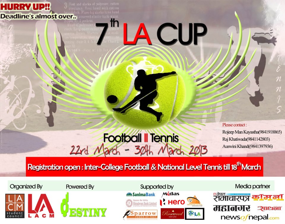 The Little Angels' College Of Management(LACM) Student Council is organizing 7th LA-Cup which includes Inter-College Football Tournament and 2nd Spring Open Tennis Tournament (in association with ANLTA).