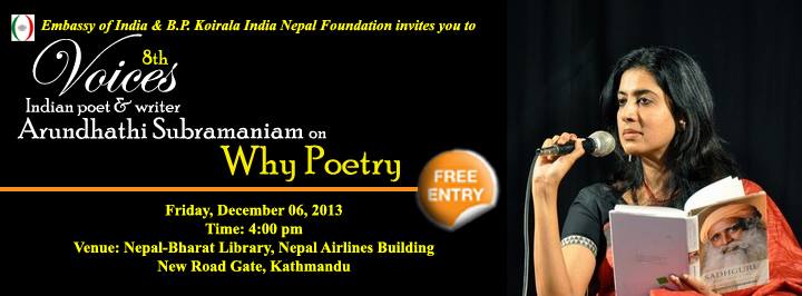 Embassy of India Kathmandu and B.P. Koirala India Nepal Foundation cordially invites you to 8th edition of Voices: Indian poet and writer Arundhathi Subramaniam on WHY POETRY. Date: Friday, December 06, 2013 Venue: Nepal Bharat Library, Nepal Airlines..