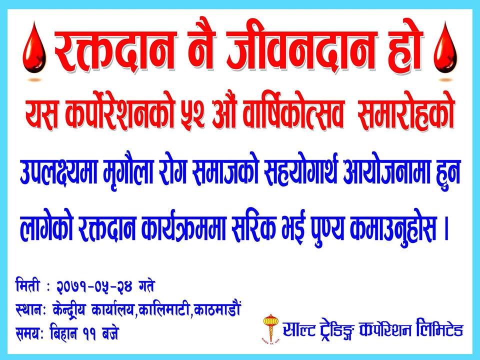 यहि भाद्र महिना को चौथो साता कालिमाटीमा ,रक्तदान कार्यक्रम हुदैछ !! यो कार्यक्रम "मिर्गौला रोग समाज नेपाल " ,सहयोगार्थ ,बिगत १५ वर्ष अघि देखिको अभ्यासको निरन्तरता हो !! रक्तदान पछिको सन्तोष अमुल्य हुन्छ !!रक्तदान ,मानवीय सद्द्भाव को अभिव्यक्ति हो - किनकि रगतलाई कुनै , धर्म , लिङ्ग ,वर्ण , देश , महादेश थाह हुदैन !! यस्तो पुण्यकार्यमा तपाइँहरुलाई हार्दिक निमन्त्रणा छ !