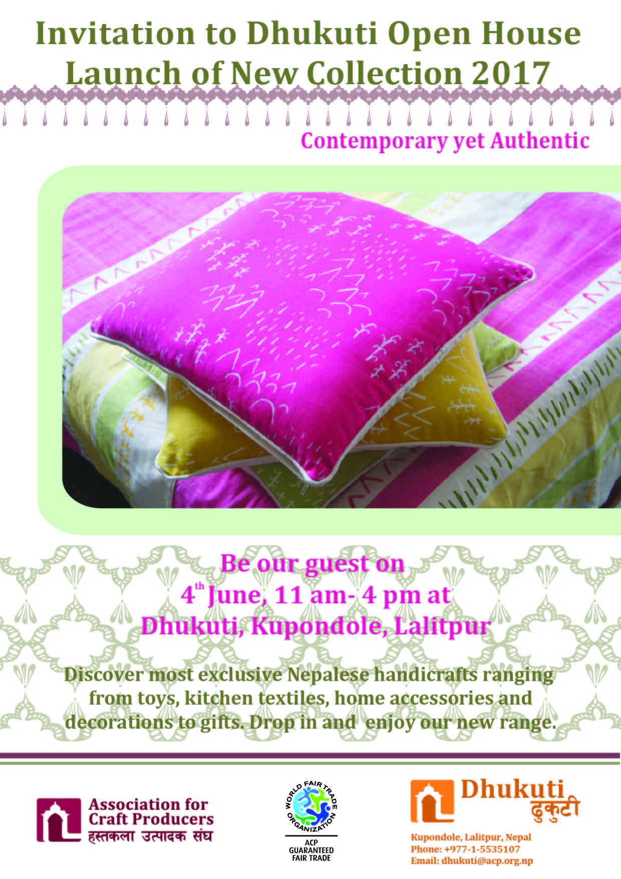 We cordially invite you to the exclusive launch of our New Product Collection 2017 on June 4th, 2017 Sunday at Dhukuti premises from 11 am till 4 pm. Please honor us with your presence and explore an exciting range of products from textiles, copper, ceramics, furniture, and many more!