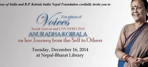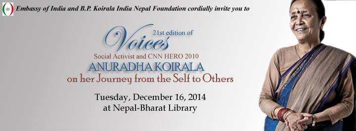Embassy of India and B.P. Koirala India-Nepal Foundation cordially invite you to 21st edition of Voices. In this edition of Voices, eminent social activist and CNN HERO 2010, Anuradha Koirala will share about her journey from the Self to Others. The intera..
