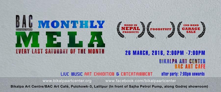 On Saturday 26th March, 2016 the Bikalpa Art Center (BAC)/ BAC ART CAFE will turn into a Festive Mela place again, hosting its' third Monthly Mela. The Mela will showcase i.) Made in Nepal products ii.) Local food and drinks and iii.) Second hand garage sale.