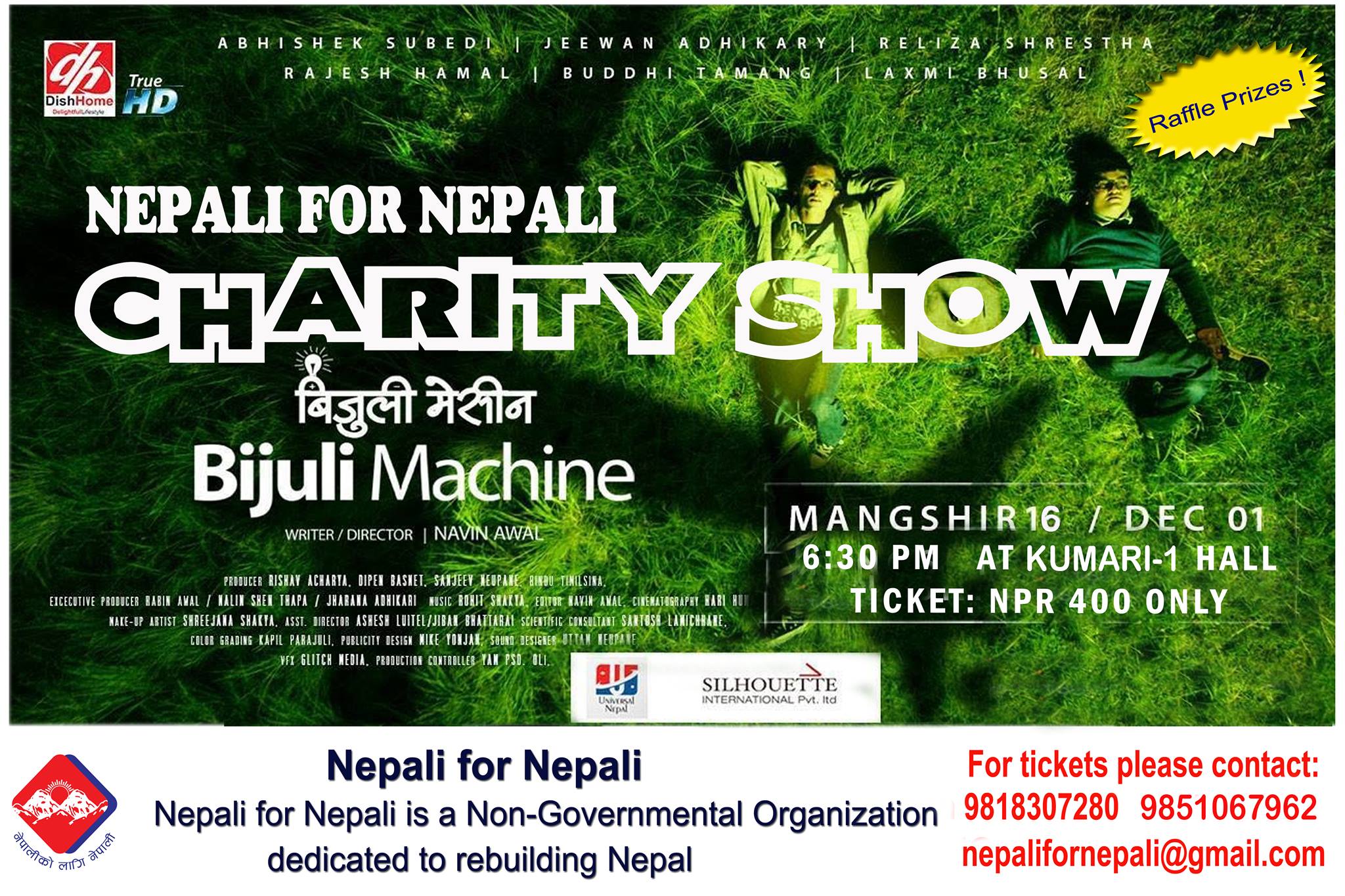 Nepali for Nepali is hosting a Charity Show for our work building homes that are environmentally friendly, locally produced, and earthquake-resistant. Featuring Nepal's first ever sci-fi movie Bijuli Machine, come enjoy a night with raffle prizes, informational talks an..