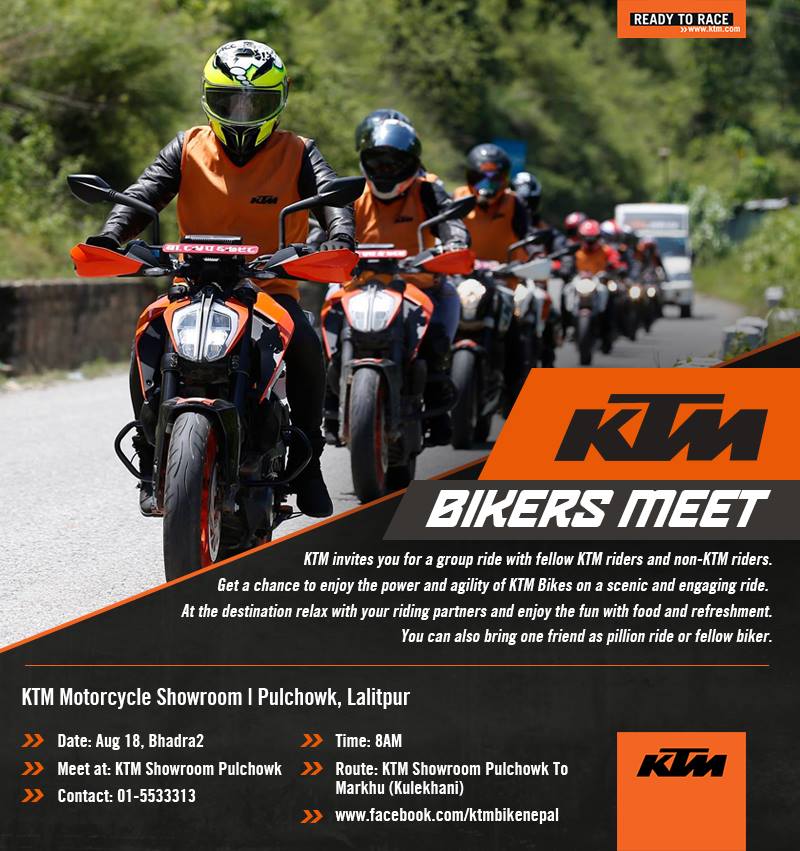 All the KTM and Non-KTM riders are informed that 'KTM-Ready to Race Nepal' is going to organize the BIKERS MEET to Markhu (Kulekhani) on 18th August, 2018 Saturday. So all the interested KTM and Non-KTM riders are requested to register their names in the KTM showroom along with one PP size photograph, Xerox copy of the Driving License & Bill Book of the bike.