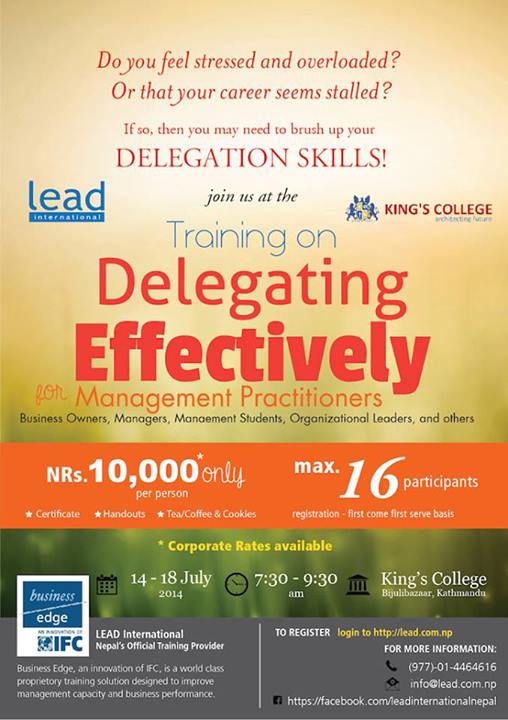 If this scenario fits you or one of your team members, we are happy to inform you that LEAD International in association with King’s College present you with an opportunity to learn about delegating your works effectively – a Business Edge™ training on “Delegating Effectively”. This five-day (2 hours a day) training will help you to: