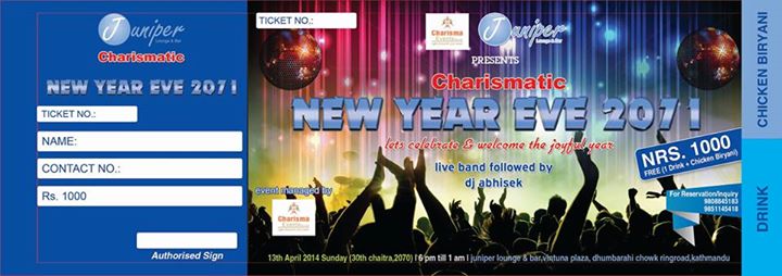 Charisma Events Pvt.Ltd. and Juniper Lounge & Bar Presents "Charismatic New Year Eve 2071" Lets welcome and celebrate this blissful New Year!!!! Attractions: LIVE BAND FOLLOWED BY DJ SESSION WITH DJ ABISHEK. Special Dance Performances. Couple Games. Lucky Draw and ..