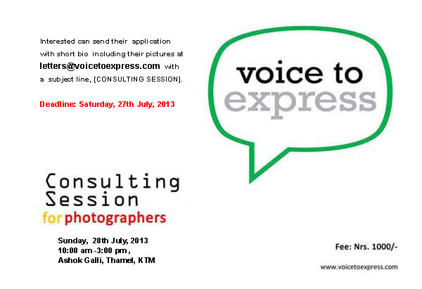Voice to Express is conducting ONE-ON-ONE "Consulting Session" for all interested Freelance / Working and Enthusiast beginner photographers who work on single image or photo-story.