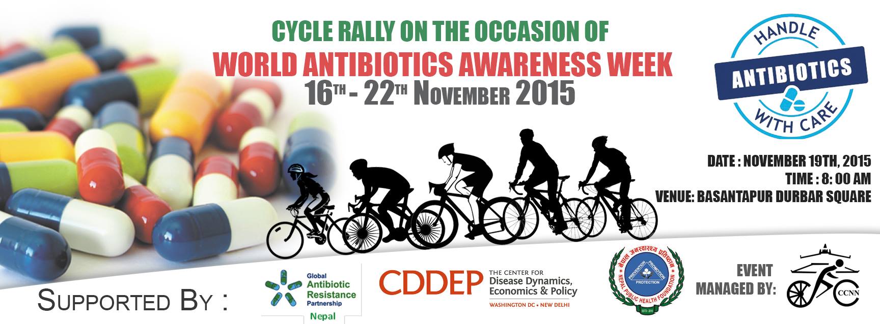 First World Antobiotics Awareness Week has been started since today with the slogan "Antibiotics - Handle with Care" till November 22nd. On November 19th, Cycle Rally is being organized starting from Basantapur at 8 AM. Lets participate in the rally and lets talk about antibiotics.