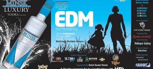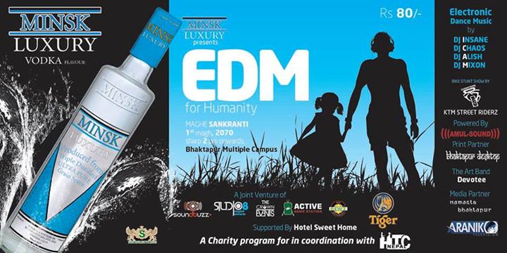 E.D.M for Humanity is a charity Dance event,which is going to be held on Wednesday 1st Magh 2070 with a motive to provide pure entertainment of music with the sense of social activity to contribute fund to a non-profit organization H.T.C As the youth of this era has now been involved to Electronic Dance Music, this event would bound them to serve a part of society with unlimited dose of pure E.D.M music played by the top Djs of the town.
