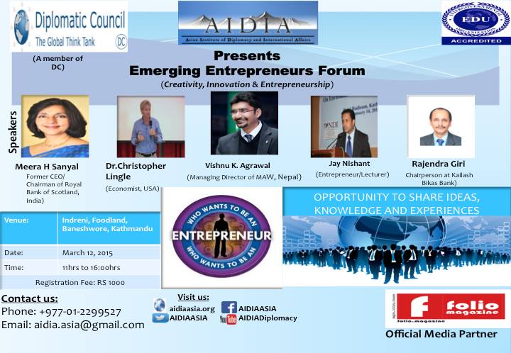 Entrepreneurship puts new business ideas into practice. In doing so, it creates jobs that facilitate personal development. With their innovative and disruptive ideas, entrepreneurs can tackle social problems too. Through this kind event in Nepal, AIDIA is hoping to bring together expert scholars and students from various sectors to come together and talk about how to become a successful Entrepreneur globally.