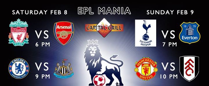 Capital Grill presents "EPL MANIA" Saturday Feb 8 LIVERPOOL vs ARSENAL 6PM CHELSEA vs NEW CASTLE 9PM Sunday Feb 9 TOTTENHAM vs EVERTON 7PM MAN UNI vs FULHAM 10PM Enjoy footy with chilled beers. See you all!!!..