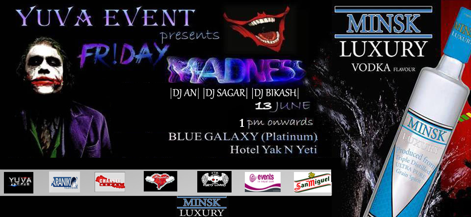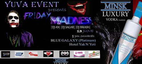 Yuva event proudly presents "FRIDAY MADNESS" DJ AN DJ SAGAR DJ BIKASH ▲WHY PARTY WITH US _____________________________________________ We guarantee : ✦ Great Location ✦ Best Music ✦ Safe Location ✦ Exclusive Glam Crowd ✦ SAFE ENVIRONMENT ************************************************..