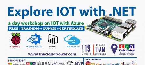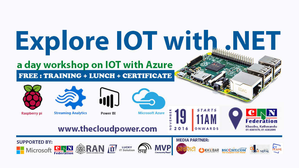 The Cloud Power in partnership with Federation of Computer Association Nepal, Robotics Association of Nepal and Maulik Taranga is organizing one day free workshop on IOT with Azure on 19th Nov at CAN Federation Khusibu.