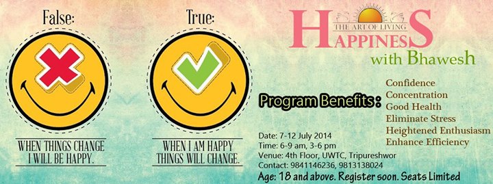 Happiness Program is a 6 days workshop of The Art of Living Date: July 7-12, 2014 Time: 6-9 am, 3-6 pm Venue: DECC, UWTC, Tripureshwor Contact: 9841146236, 9813138024, 9803199537, 9803572935 Register soon. Seats Limited...