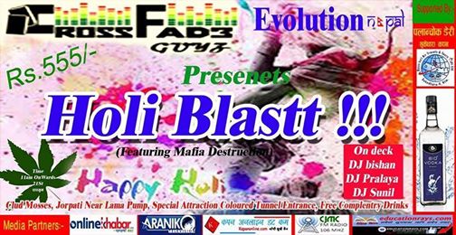 CROSS FADE GUYZ along with EVOLUTION NEPAL Presents HOLI BLASTT !!! Festive Of Colors Nepal's Biggest Bash Happening at CLUB MOSSES #JORPATI -THE HOLI FESTIVAL OF COLORS NEPAL- █████████████████████████ Atmosphere Entertained BY . #..