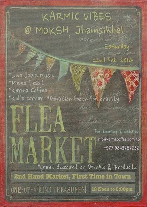 "Flea Market" 2nd hand (books/music/clothes/furnitures/accessories) *Live Jazz music @ Moksh Garden *Pizza Feast *Karma Coffee *Great Discount on Drinks & Products *Kid's Corner *Donation booth for charity. Event Hosted..