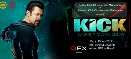 Rotary & Rotaract Club Of Jawalakhel Manjushree is organizing a charity film screening of movie ‘KICK’ in 25th July, 6:30PM at QFX Jai Nepal. The funds collected from the following event will be used for the benefits of underprivileged student of Shree Suryodaya Bal Bikash Primary School Imadol, Lalitpur.