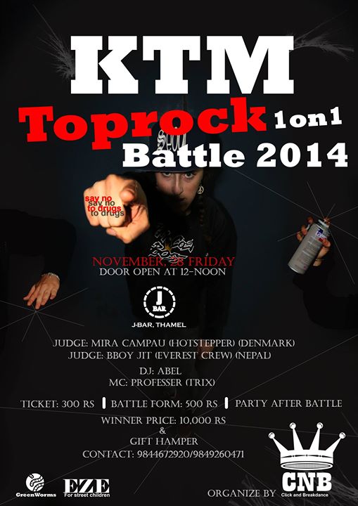 First time in Nepal that you will get the chance to show your style in Toprocking. Winner price: 10,000 Rs and gift hamper Party after battle Battle reregistration form: 500 Rs Ticket: 300 Rs with party Contact here for form and Ticket: 9844672920, 9849260471..