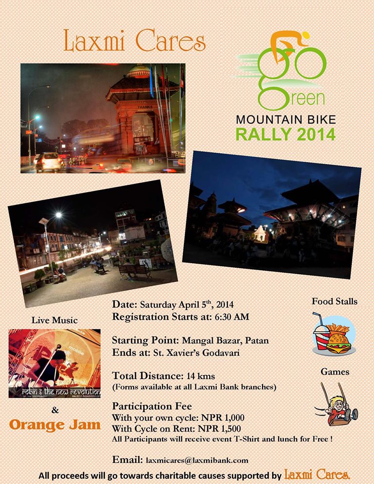 As part of the "Ujyaalo Abhiyaan" under “Go Green” campaign, the Annual Laxmi Cares Mountain Bike Rally is being held on Saturday, April 5th 2014. This is an annual event aimed at creating awareness and raising funds to assist Ujyaalo Abhiyaan project which aims to continue in it's journey to light various sites in Nepal with historical, architectural and heritage values. In the previous years, Ujyaalo Abhiyaan installed solar lights at Bagmati Bridge and Patan Durbar Square. We recently completed our project at Singh Durbar - Bhadrakali.