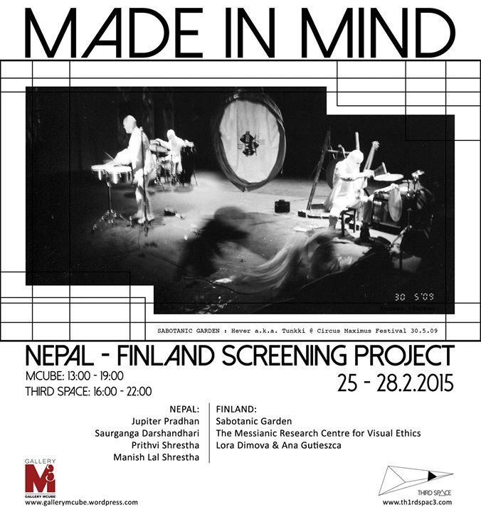 Gallery Mcube in collaboration with Third Space- Finland cordially invite you to "MADE IN MIND" NEPAL-FINLAND SCREENING PROJECT of performance art of Artists from Nepal and Finland. Featuring performance art from Sabotanic Garden - Finland The Messianic..