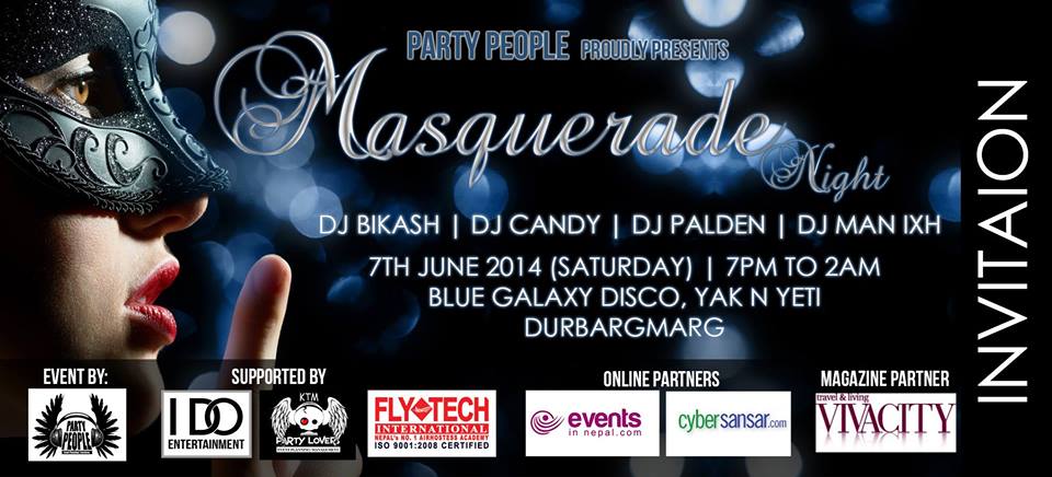 Party People Proudly Presents "Masquerade Night" Dj Candy Dj Man IxhDj bikash Dj Palden Venue - Blue Galaxy Disco , Yak & Yeti ,Durbarmarg ( old Club Platinum ) Time - 7pm to 2am Date - 7juneMore info uploading soon........................ contactSapan Magar 9808263228,984340..