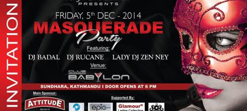 Knights Entertainment presents Masquerade Party @ New ClubBabylon Dj:-Dj Badal Dj Rucane #Dj Zen Ney(Ladies) Main Sponcer by:- My NEPAL My Attitude Vodaka Supported by:- Knob Dj School,ECP Dream,New Club Babylone Date: Dec 5 Friday Time:7pm Onwards Venue:Babylone..