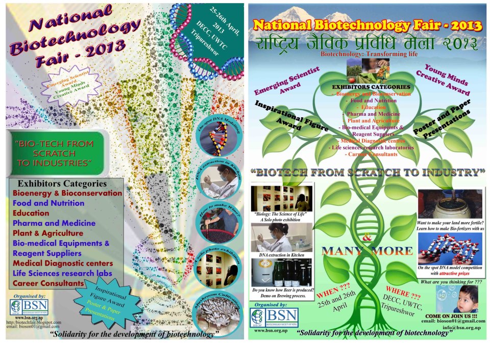 BSN would like to inform you that, BSN is organizing NATIONAL BIOTECHNOLOGY FAIR-2013 (राष्ट्रिय जैवीक प्रबिधी मेला) on 25th and 26th April, 2013, as our regular event celebrating WORLD DNA AND GENOME DAY. It is an immense pleasure to inform you about the fair since this is going to be the season of celebration to all the Life Science students, professionals, scientists, activists. The fair will include following events: