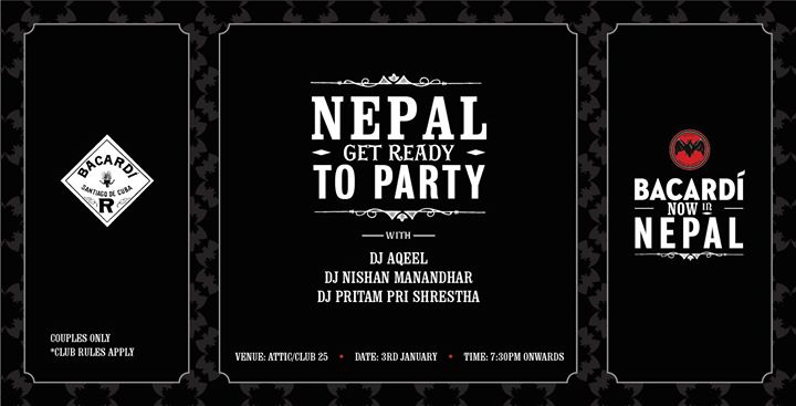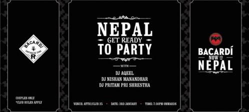 “Many Artist’s, Many Genre’s One Spirit !...Join us on the 3rd of January @ Club 25 hrs for the most Untameable Launch in the History of NEPAL. Time to show us your ir-repressible spirit coz BACARDI IS IN NEPAL. Cover charge of Rs. 3000/- per couple. couples only & Limited entry.” Unlimi..