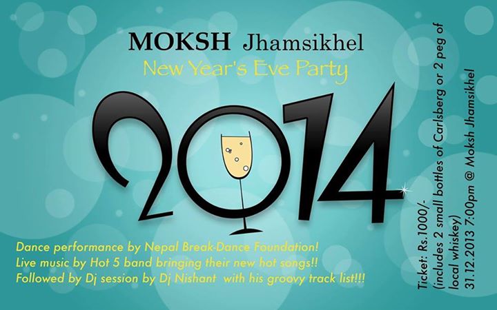 Lets Welcome New Year 2014 together @ Moksh Dance performance by Nepal Break-Dance Foundation followed by Live Music by hot 5 band bringing their new hot songs and Dj session by Dj Nishant with his groovy track lists. Tickets 1000/- (includes 2 small bottles of Carlsberg or 2 peg of local whiskey)..