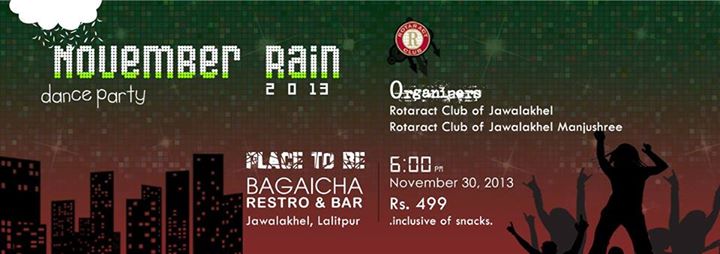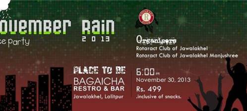 After 4 successful years, we, Rotaract Club of Jawalakhel Manjushree and Rotaract Club of Jawalakhel, bring to you "NOVEMBER RAIN 2013". We are ready with the dance floor, lights & music, and we hope you all are ready to set the floor on fire.