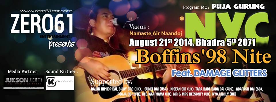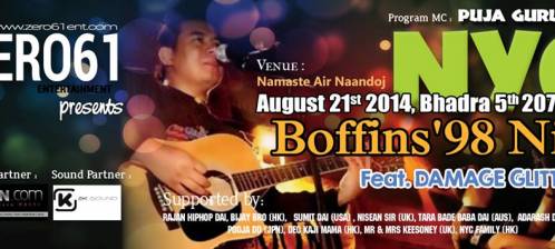 Zero61 Entertainment Pvt. Ltd. Proudly presents NYC BOFFINS"98 feat. DAMAGE GLITTERS on Bhadra 5th( August 21st) on the Only Restaurent in Nepal that Have a Real Plane for in it.. Boffins98 is well known Patriotic Band of Nepal who has those Songs that make us feel a Nepali such as Sira Jasto Sagamatha, Karadau saantaan Nepal ka, Ma mare pani Yo desh ko maya cha and many more... and we are also planning ti raise fund foe the sunkoshi & bhotekoshi victims in the event!! so Be there ppl