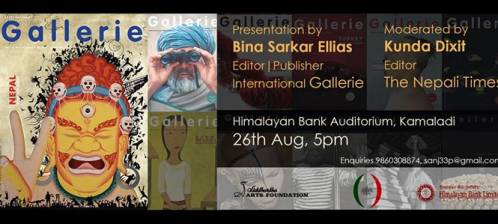 Siddhartha Arts Foundation with support from B. P. Koirala Foundation and Himalayan Bank Limited is organizingPresentation by Bina Sarkar Ellias Editor/Publisher, International Gallerie Moderated by Kunda Dixit Editor, The Nepali Times Venue: Himalayan Bank Auditorium, Kamaladi Date: 26th August..
