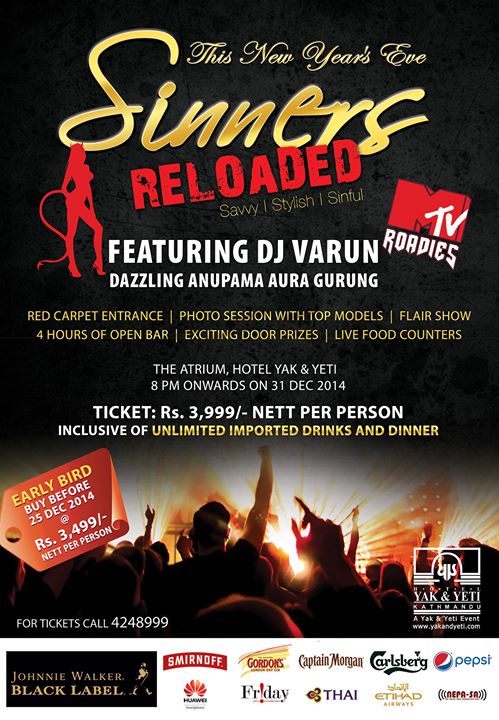 *****This New Year’s Eve, Be Savvy, Stylish & Sinful***** Presenting you Sinners Reloaded featuring DJ Varun & Dazzling Anupama Aura Gurung. Major Attractions: Red Carpet Entrance Photo Session with Top Models Flair Show 4 Hours of Open Bar Exciting Door Prizes Live Food Counters Venue: Th..