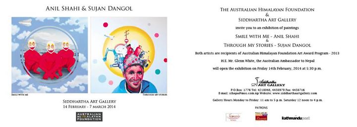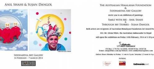 The Australian Himalayan Foundation & Siddhartha Art Gallery invites you to an exhibition of paintings "Smile With Me" - Anil Shahi & "Through My Stories" - Sujan Dangol H.E. Mr. Glenn White, The Australian Ambassador to Nepal will open the Exhibition on Friday 14th February, 2014 at 5:30 ..