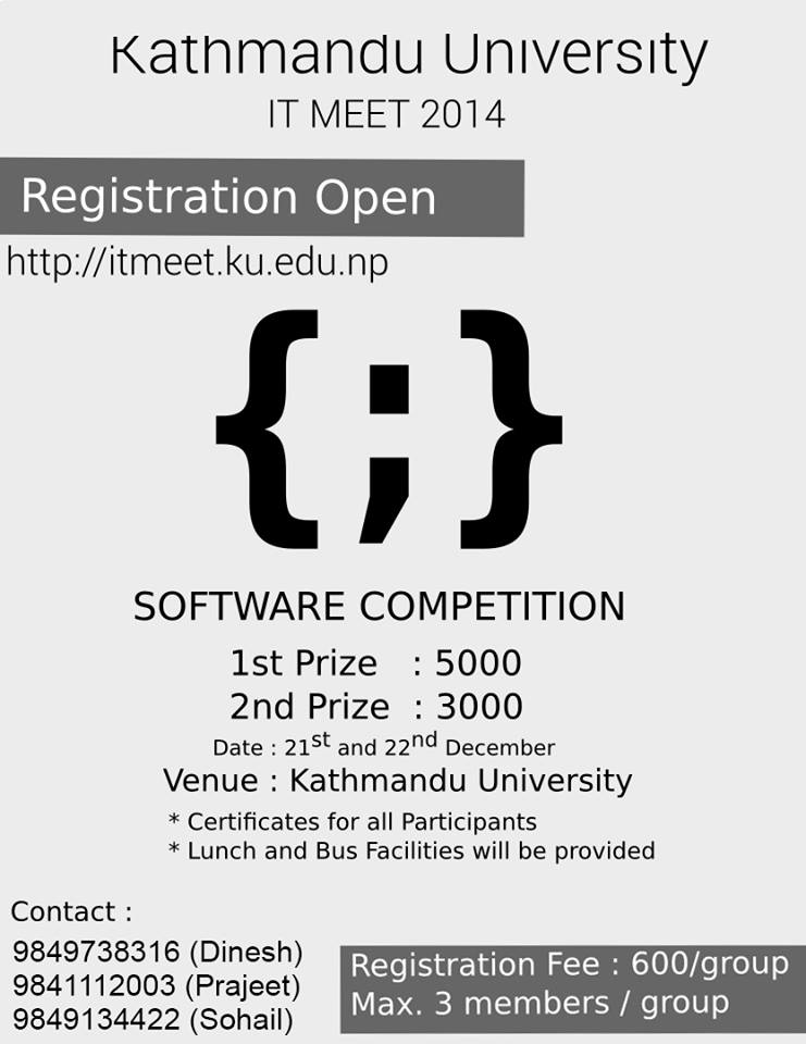 KU ITMEET 2014 is organizing software competition on 21st and 22nd December at Kathmandu University. Do not miss this opportunity. Participate and grab the prizes. Registration link: https://docs.google.com/forms/d/1mj5Y78gtWievmoOPS-5p_jmyQEj-OhA0_t097P7PxnY/vie..