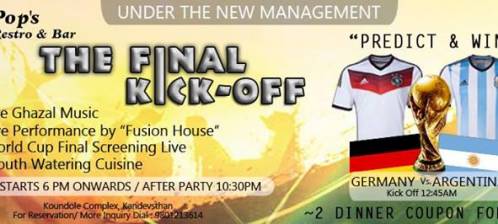 Pop's Restro & Bar (Under New Management) Presents "THE FINAL KICK-OFF" The World Cup 201 Final's "Germany VS Argentina" For the Eve We have: >Live Ghazal Music >Live Performance by "Fusion House" >Live Projection of the Game >Mouth Watering Cuisine For more Information and Reserv..