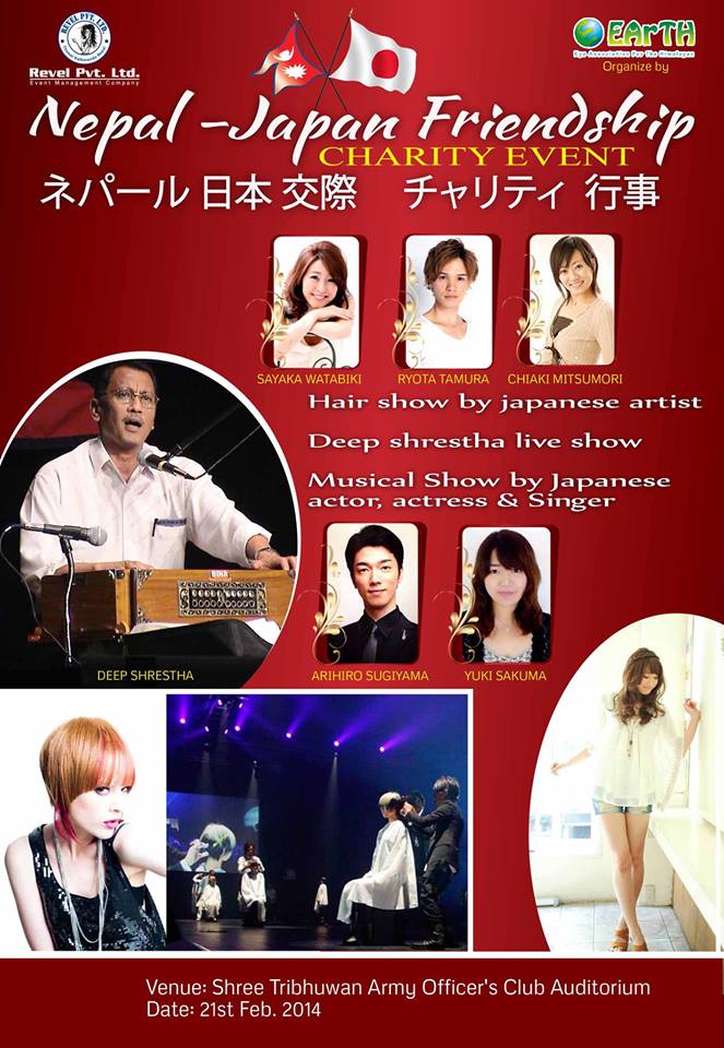 “The First Nepal x Japan Friendship Charity Event”For Himalayan Eye Health Medical Camp.21st Feb 2014 6PM to 8PMHair styling beauty showmusical by Japanese singer and actors and more!500Nrs/1000Nrs Ticket available @ Liberty Holidays