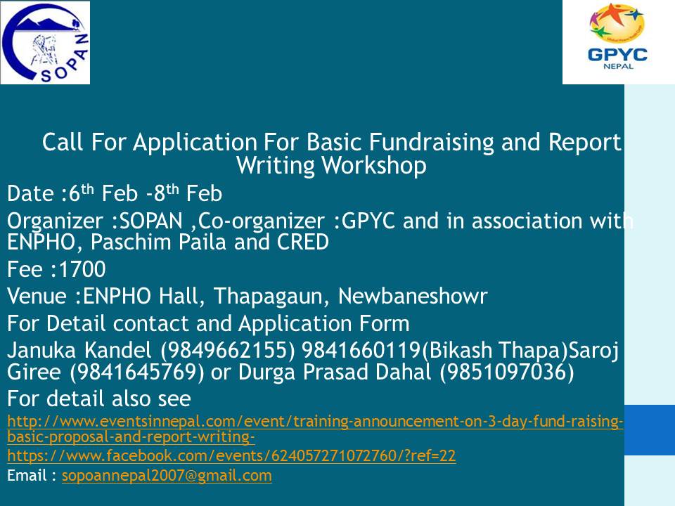 In Nepal fund raising basic and proposal writing cum report writing is almost essential in every sectors development, academic and business however type of fund raising and plan may differ according to sector. Hence, SOPAN has introduced the Fund Raising Basic and Report Writing Workshop cum training for introducing basic concept and procedure of fundraising and report preparing report especially targeting fresh student’s graduates, currently enrolled students in Bachelor or above stream, fresh job starter at NGO.