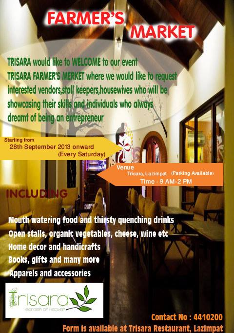 TRISARA would like to WELCOME to our event 'TRISARA FARMER'S MARKET' where we would like to request interested vendors, stall keepers, housewives who will be showcasing their skills and individuals who always dreamt of being an entrepreneur.