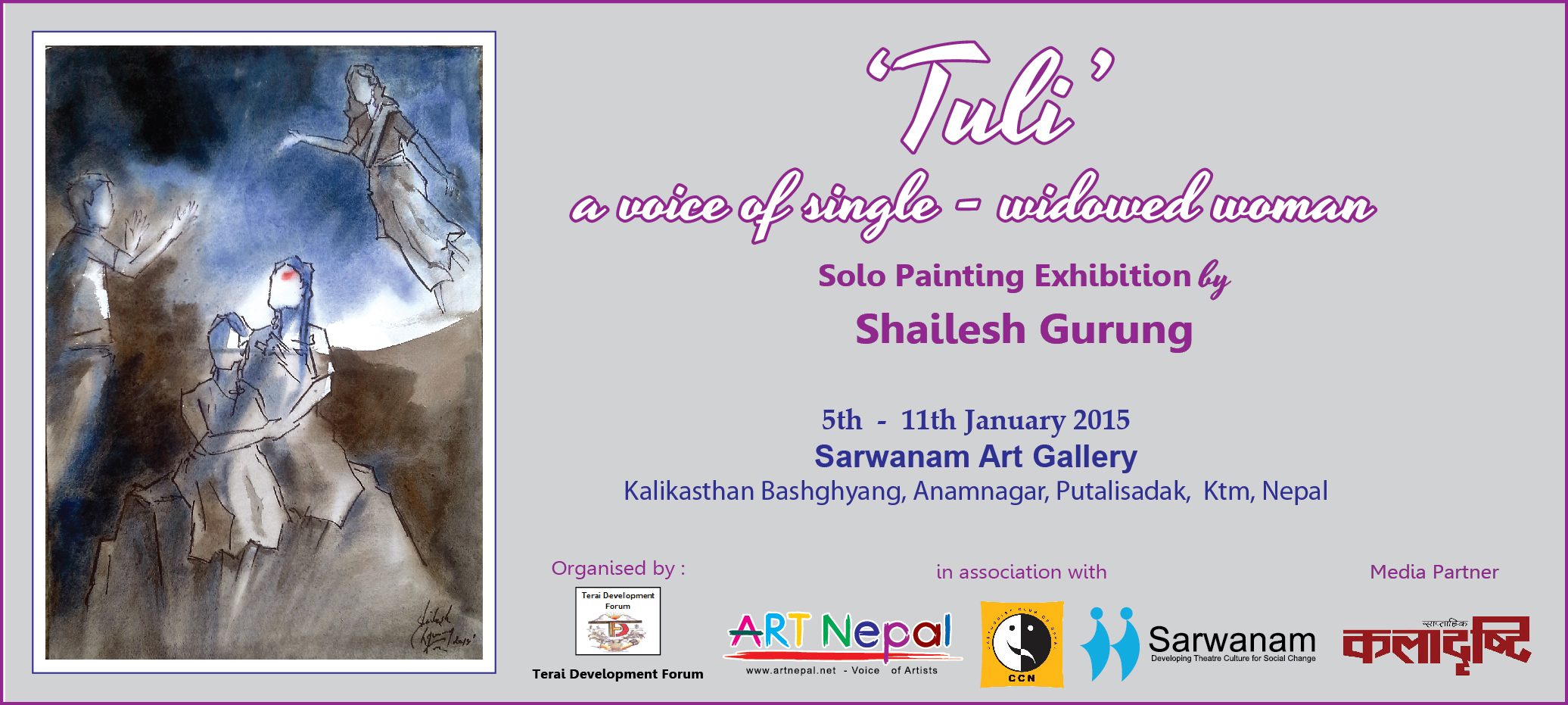 "TULI - a voice of single - widowed woman" a solo Paintings Exhibitionby Sailesh Gurung (from Bhairahawa)organised by Tarai Development Forumin association withARTNepal, Cartoonists' Club of Nepal - CCN and Sarwanam.The exhibition will be inaugurated byRagini Upadhayaythe Chancellor of Nepal Academ..
