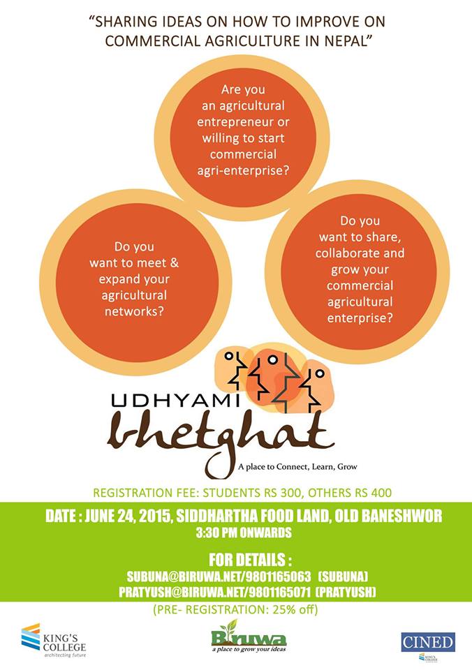 Udhyami Bhetghat is a series of sector-focused networking event organized jointly by Biruwa Ventures and Kings College. This event's goal is to help entrepreneurs expand their professional network, facilitate knowledge sharing, co-creation, collaboration within the Nepali entrepreneurial community by bringing together entrepreneurs that are at various stages in their venture.