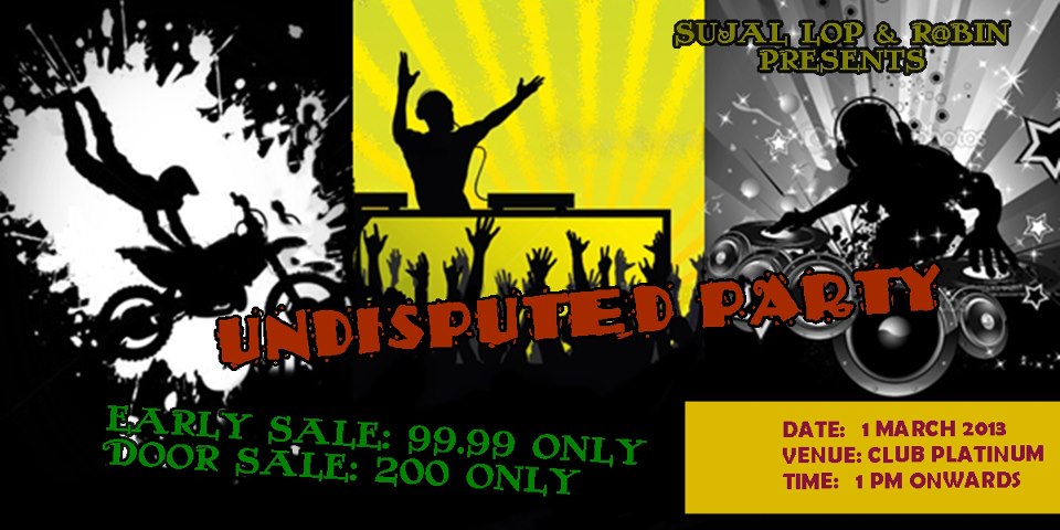 rE-birth @fter 2012 Be readY to sweat Your whole bodY In dA Dance floor wId fearless..!!!!Coz we R safe Now Not to worriesss now we can face comIng up all danger..... Coz we R Undisputed GuYsUNDISPUTED PARTY Ticket price:Rs.99..99 Only Dor Sale:Rs 200 Fixed..So GuYs hurrY up ticke..