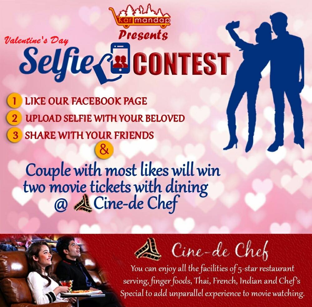 Kartmandap.com presents Valentine's Day Couple Selfie ContestSTEPS TO PARTICIPATE >>1. LIKE OUR FACEBOOK PAGE2. UPLOAD SELFIE WITH YOUR BELOVED3. SHARE WITH YOUR FRIENDSCOUPLE WITH MOST LIKES WILL WIN TWO MOVIE TICKETS WITH DINING @ CINE-DE-CHEF, CTC MALL...