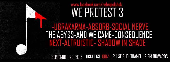 The series of "Protest movements" continues. -Ugrakarma -Absorb -And we came -Breach not broken -Consequence -Social Nerve -Shadow in Shade -Altruistic -Next Venue : PULSE PUB (THAMEL) Ticket Price : 100 Only !..