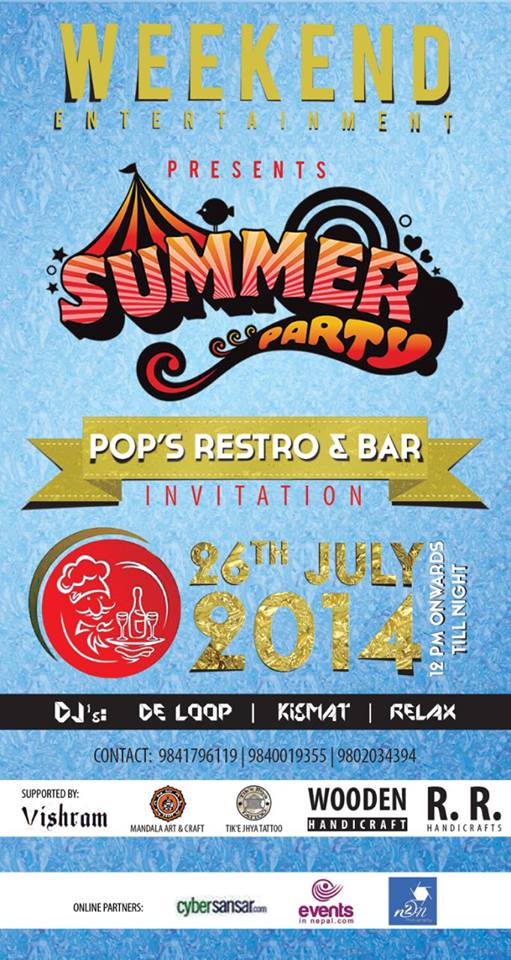 ........Weekend entertainment presents........ SUMMER PARTY On The Deck :- De Loop Dj Kismat Dj Relax Dj Azen Supported by :- ktm partylover,vishram,tiki jhaya,mandala art n craft,R.R,Wooden handicraft Online Partner :- Cyber sansar,Events in nepal,n2n Sound Partner :-d sound Details :- Venue:pops r..